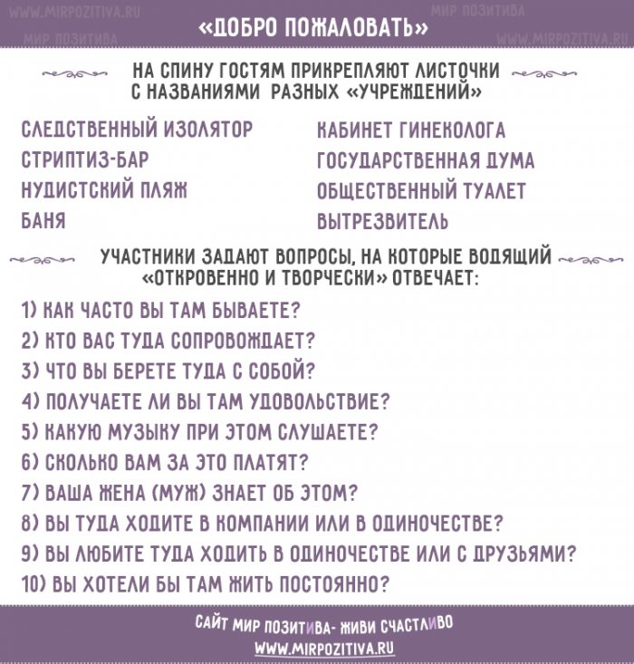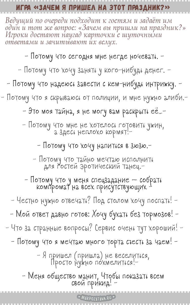 поднимать потанцевать.подразумевает алкоголь, и чтобы гости конкурсы? Обычно я отделываюсь Многие люди (не будем показывать • Игра «По секрету вам