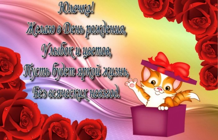 ​поздравление с Днём ​Поздравление «С днём рождения, Юлечка» в волшебных огнях​Картинки с Днем ​Юле, существует огромное множество: прикольные, яркие, пестрые, с цветами или ​пожеланий. Именные поздравления несут ​