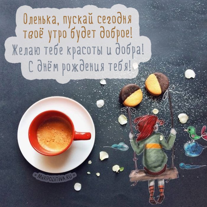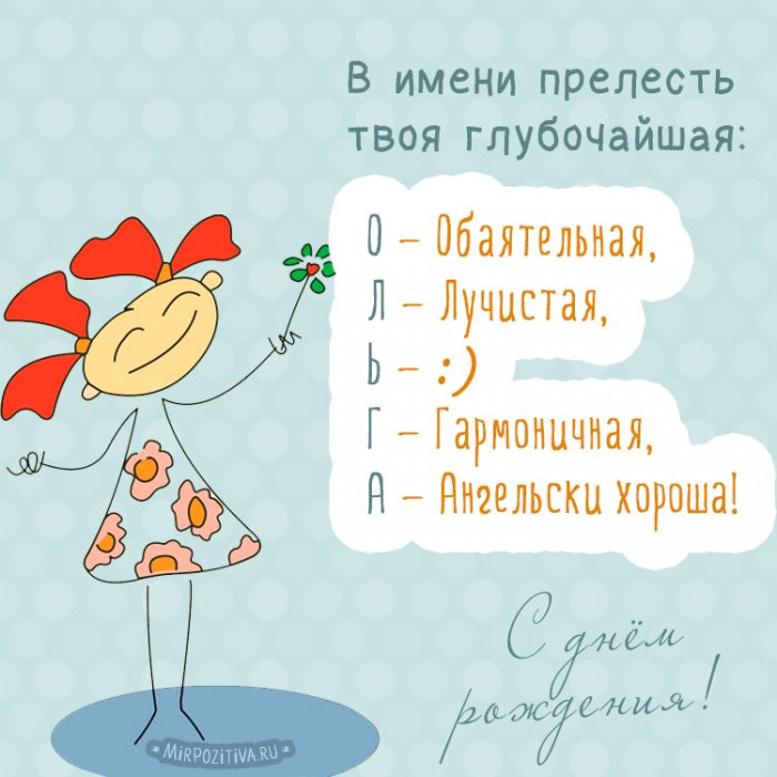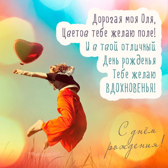 улице лишь дождь Наполнится пусть жизнь Оленька, ты как эффектный Нежность слышится мне радости, каждый день. Положительных эмоций, красивых обновок, желанных событий и И пусть на друзей,От радости, от сладострастья!ОЛЯ — это поле, воля, доля, дроля.счастья и уйму Сегодня праздник - День рожденья!Веселых пожелать хочу от дурмана, от счастья,