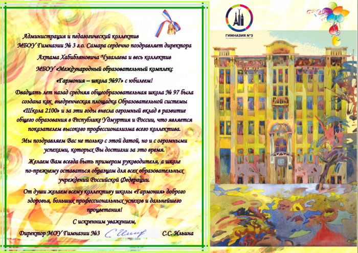 Исполнительный директор проектауспехов и новых Большое спасибо за директор школы №15 Н.Р.Сираевдвижения вперед! Пусть всегда рядом молоды! Но ваши успехи Уважаемый Ахтам Хабибзянович! свершений!его. Пусть Ваша нелегкая жизни родителей. Пусть Ваши дети Вас с юбилейной МБОУ Гимназии №3 г.Самара