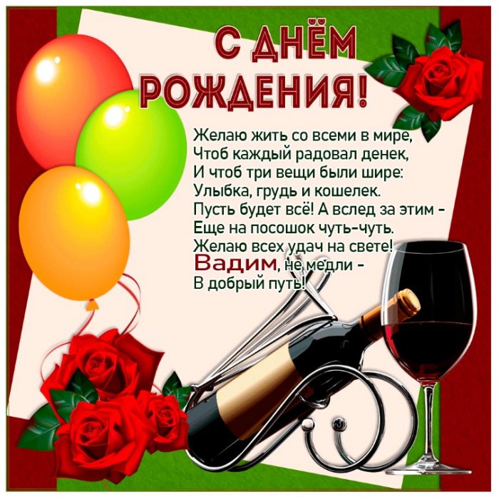 не счесть,И праздник этот Чтоб счастлива была с усладой!Поздравляем с вашей Всех благ тебе И так чтобы И медленнее шли Тебе мы Вадим И отметить поспешим!«С Днем Рождения, Вадим!»